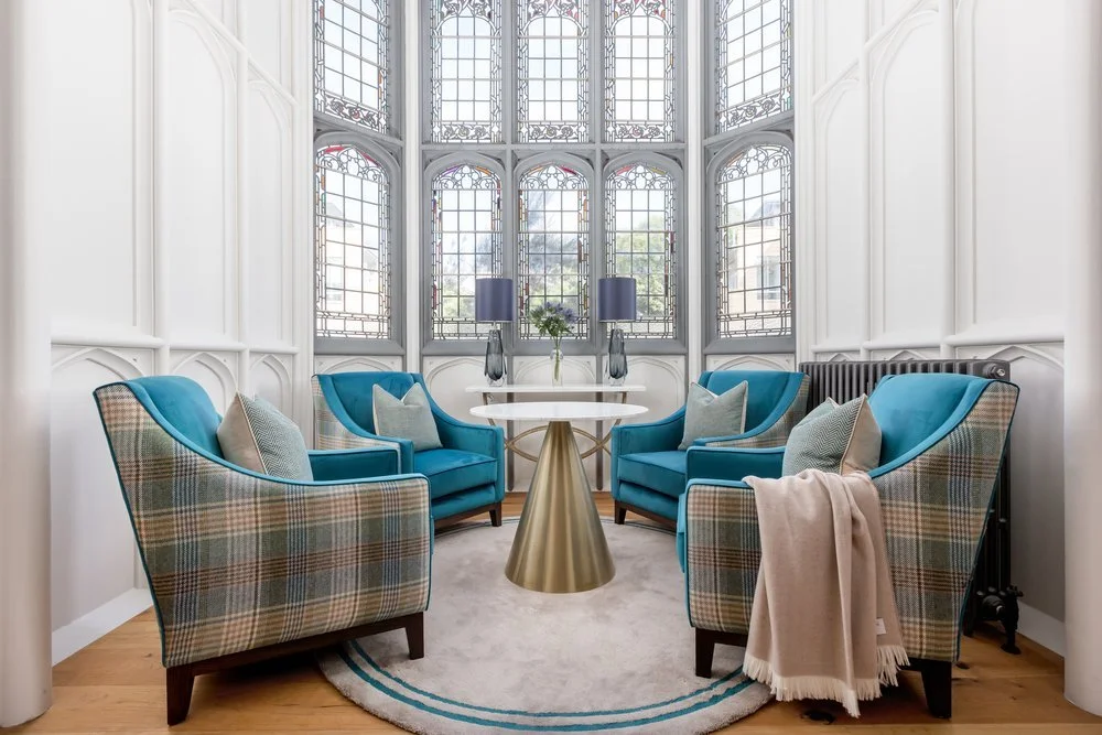 Featuring gorgeous architectural details and stunning stained glass windows, this project seamlessly incorporates the rich jewel tones of the stained glass throughout the design. Bespoke furniture, intricate detailing, and the use of rich velvets, opulent tones, and luxurious marble finishes create a truly lavish atmosphere. The layering of textures adds depth and warmth, making the space feel exceptionally luxurious.